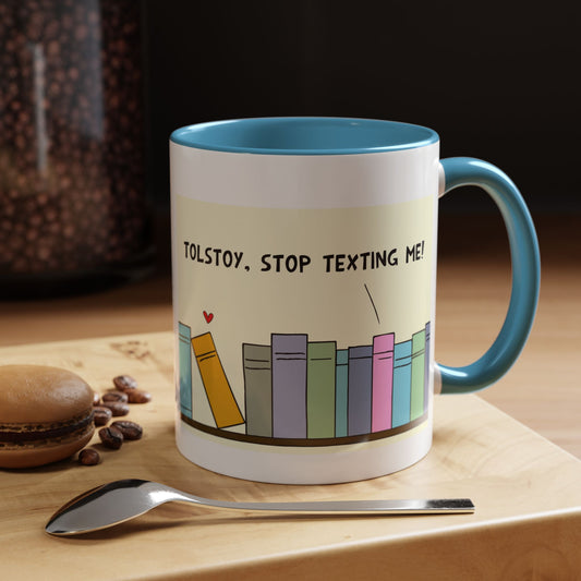 Funny Pun With Books Tolstoy And Texting A Lover Accent Coffee Mug 11 oz