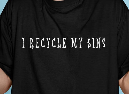 Sarcastic Humor Joke Recycling Sins A Sinner A Saint Hell And Heavens Black Cotton Shirt With White White Letters Text