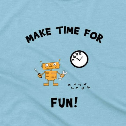 Funny Orange Robot With A Wall Clock Make Time For Fun! Inspirational Message cotton t-shirt for pre-teen boys