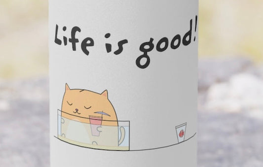 Life Is Good Water Bottle With A Cute Cat And A Fish Stainless Steel 12oz, 18oz, 32oz