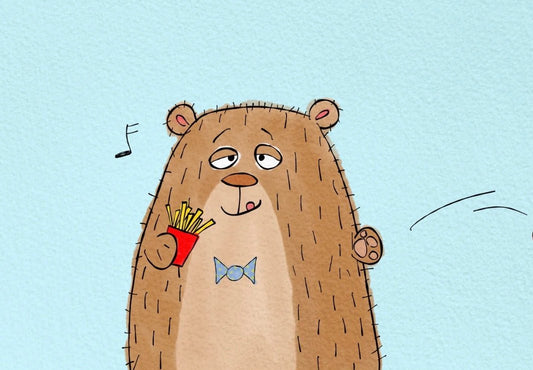Funny Bear Eating Apple And French Fries Joke About FDA Food Pyramid And Nutrition print for kitchen or living room