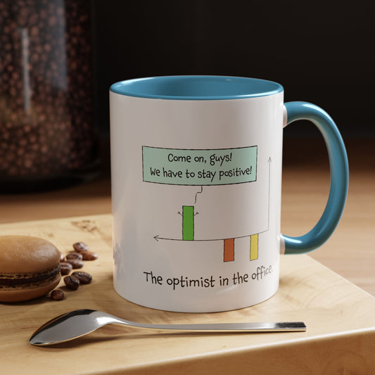 The Optimist In The Office And Positive Attitude pun joke colorful accent coffee mug 11oz and 15oz