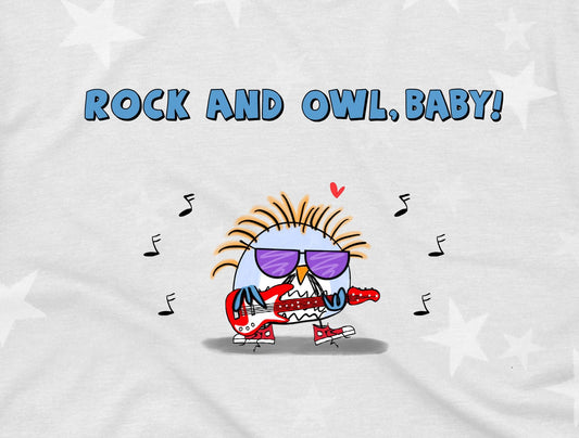 80's Classic Rock Funny Shirt Owl With Mustache Playing Guitar Rock And Roll, Baby! cotton t-shirt