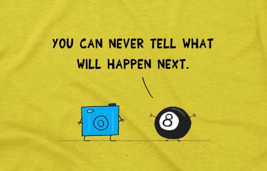 Funny T-Shirt With Cartoon Of 8 Ball Predicting The Future To A Digital Camera classic fit cotton t-shirt