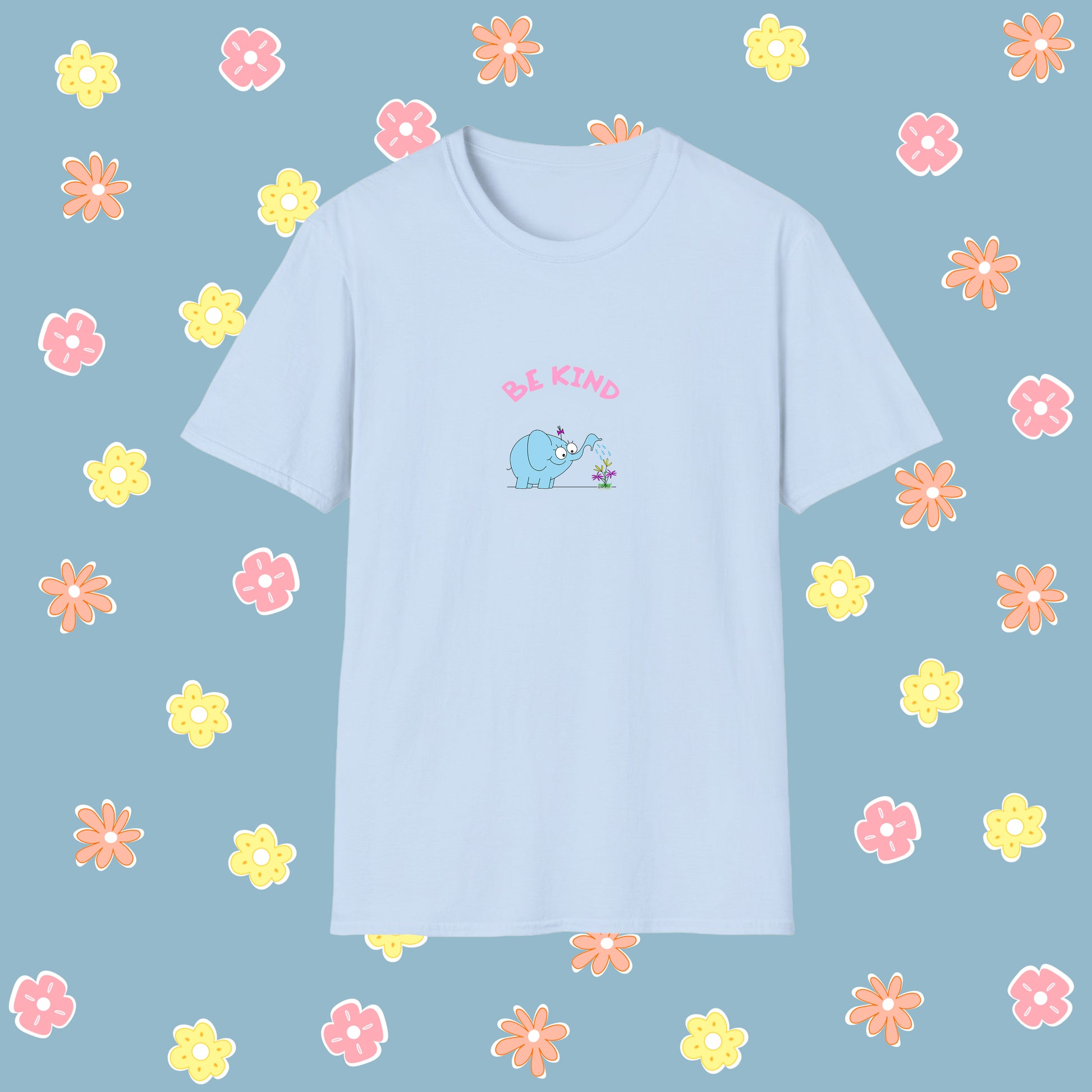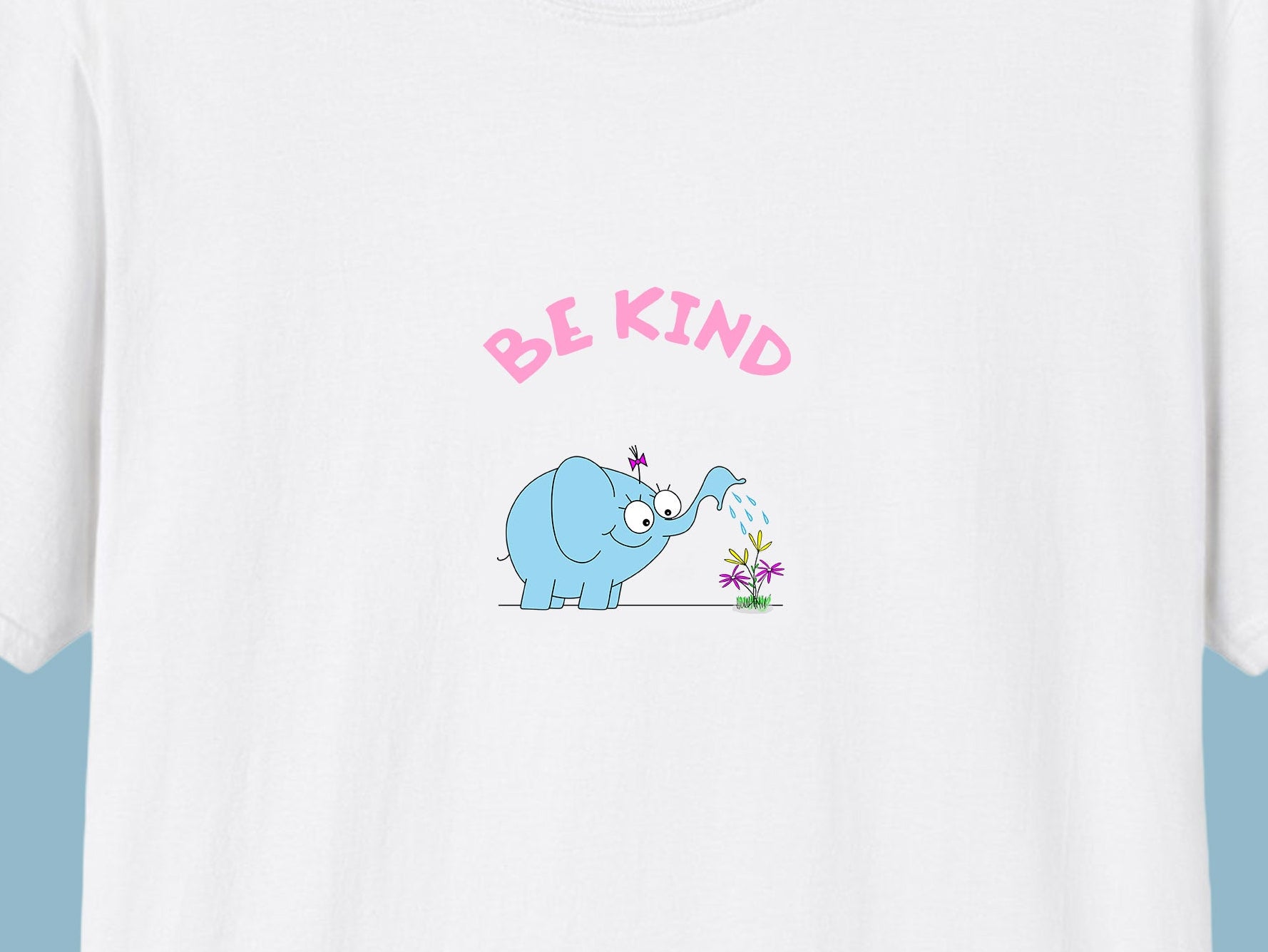 Women’s T-Shirt With Cute Elephant Positive Message Be Kind cotton white blue red colors